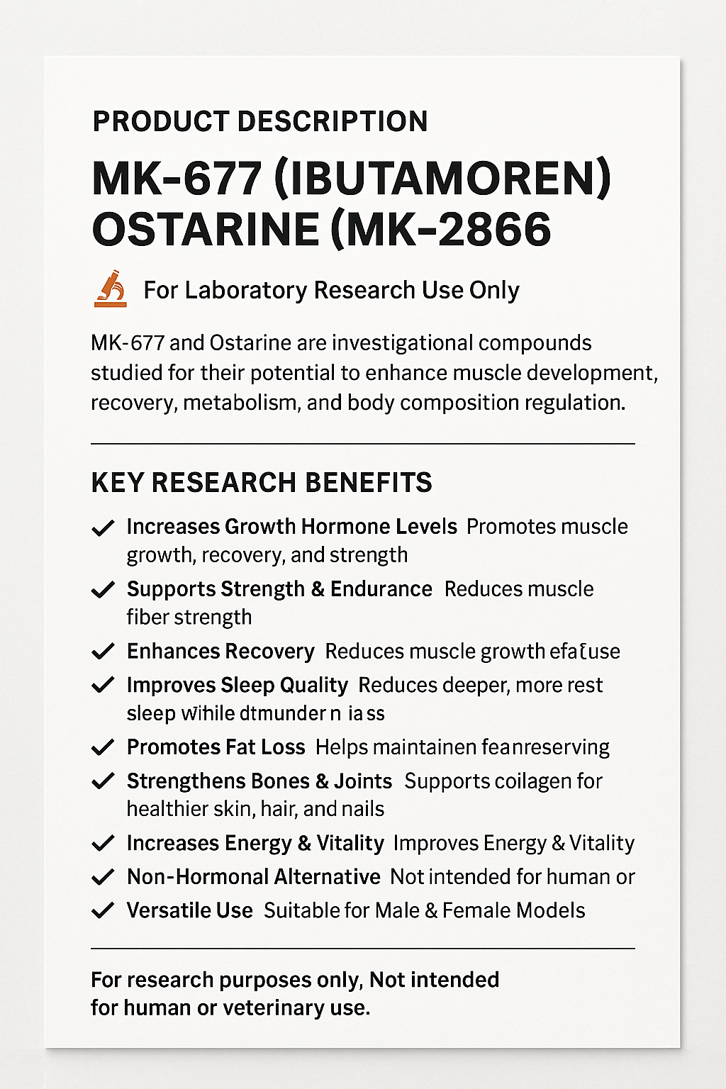 MK-677 and Ostarine are investigational compounds studied for their potential to enhance muscle development, recovery, metabolism, and body composition regulation. These compounds are widely used in preclinical models evaluating anabolic activity, hormone signaling, and metabolic optimization.